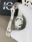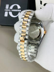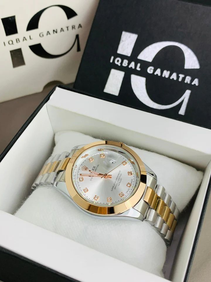 This elegant two-tone wristwatch features a striking gold-and-silver design with a polished stainless-steel and gold-plated Jubilee-style bracelet. The dial showcases a rich gold finish accented with diamond-style hour markers, giving it a luxurious and refined appearance. It includes a date window at the 3 o’clock position with a magnifying lens for easy readability. The watch has a smooth, glossy gold bezel that enhances its premium look, while the gold crown adds an extra touch of sophistication. Perfect for both formal and everyday wear, this timepiece blends classic styling with eye-catching details.